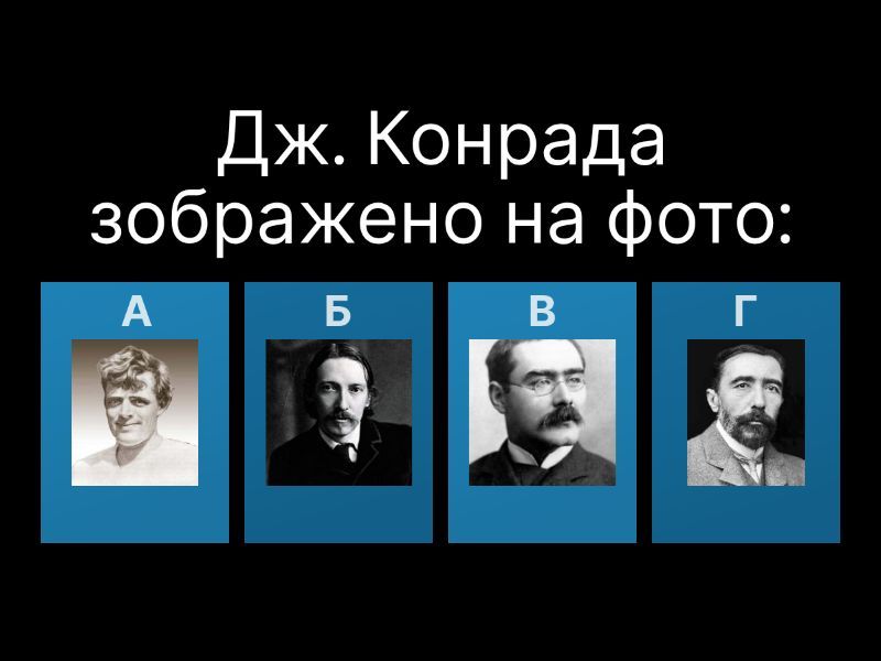 1) Дж. Конрада зображено на фото: a) b) c) d) 2) Автонім письменника... a) Юзеф Теодор Конрад Коженьовський b) Адам Бернард Міцкевич c) Юліуш Словацький d) Генрик Сенкевич 3) Дж.Конрад народився в ... a) Польщі b) Україні c) Литві d) Чехії 4) Творчість Дж.Конрада представляє ... літературу. a) англійську b) українську c) американську d) польську 5) Твір "Серце пітьми" Дж.Конрад створив... a) після подорожі до Африки b) за розповідями приятеля c) на основі газетних статей d) за матеріалами кримінальної справи 6) Особливість композиції твору "Серце пітьми" - ... a) "розповідь в розповіді" b) відкритий фінал c) ретроспективна зав'язка d) відсутність кульмінації 7) Оповідачами у творі "Серце пітьми" є... a) автор b) агент Курц c) Чарлз Марлоу d) Арлекін 8) Події твору "Серце пітьми" розгортаються в ... a) Африці b) Азії c) Австралії d) Америці 9) Назва роману натякає на ... a) "чорний континент" b) моральне падіння людини c) трагічне кохання d) загибель персонажів 10) Головні теми твору "Серце пітьми": a) засудження колоніальної політики b) зображення "темряви душі" людини c) опис природи та звичаїв тубільців d) роздуми про сенс життя 11) За мотивами роману Дж.Конрада створено фільм... a) b) c) d)