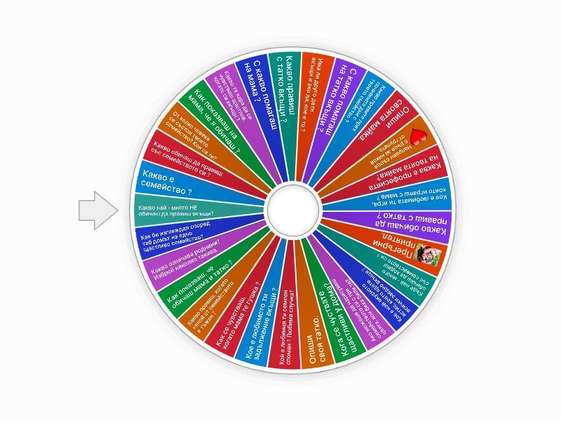 1) Какво е семейство ? 2) Какво обичаш да правиш със семейството си ? 3) От колко човека се състои твоето семейство? Кои са те? 4) Как показваш на мама, че я обичаш ? 5) Какво те кара да се чувстваш щастлив, когато си вкъщи ? 6) С какво помагаш на мама ? 7) Какво правиш с татко вкъщи ? 8) Има ли друго дете вкъщи и ако да, кое е то ? 9) С какво помагаш на татко вкъщи ? 10) Какво правите през почивните дни с твоето смейство ? 11) Опиши своята майка. 12) Направи сърце с ръце за някой от групата. 13) Каква е професията на твоята майка? 14) Коя е любимата ти игра, която играеш с мама ? 15) Какво обичаш да правиш с татко ? 16) Прегърни приятел. 17) Къде най - много обичаш да ходиш със семейството си ?  18) Кое е най-вкусното ястие, което ядете всички заедно вкъщи ? 19) Ако можеше да нарисуваш семейството си с три цвята, кои биха били те? 20) Кога се чуствате щастливи у дома? 21) Опиши своя татко. 22) Кой е любимия ти семеен спомен ? Любима случка? 23) Кое е любимото ти задължение вкъщи ? 24) Как се чувстваш, когато мама те гушка ? 25) Какво правиш, когато някой от семейството е тъжен ? 26) Как показваш, че обичаш мама и татко ? 27) Какво означава роднини? Изброй няколко такива.  28) Как би изглеждал според теб домът на едно щастливо семейство? 29) Какво най - много НЕ обичаш да правиш вкъщи?