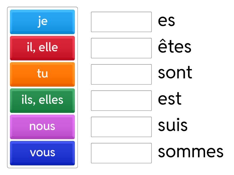 je - suis, tu - es, il, elle - est, nous - sommes, vous - êtes, ils, elles - sont,