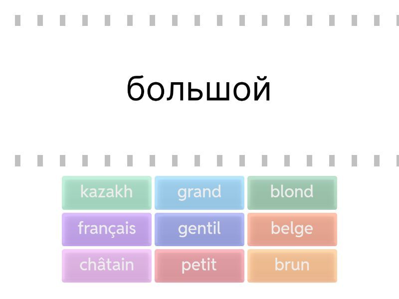 grand - большой, petit - маленький, brun - брюнет, blond - блондин, châtain - шатен, gentil - добрый, kazakh - казах / казахский, belge - бельгиец, français - француз,