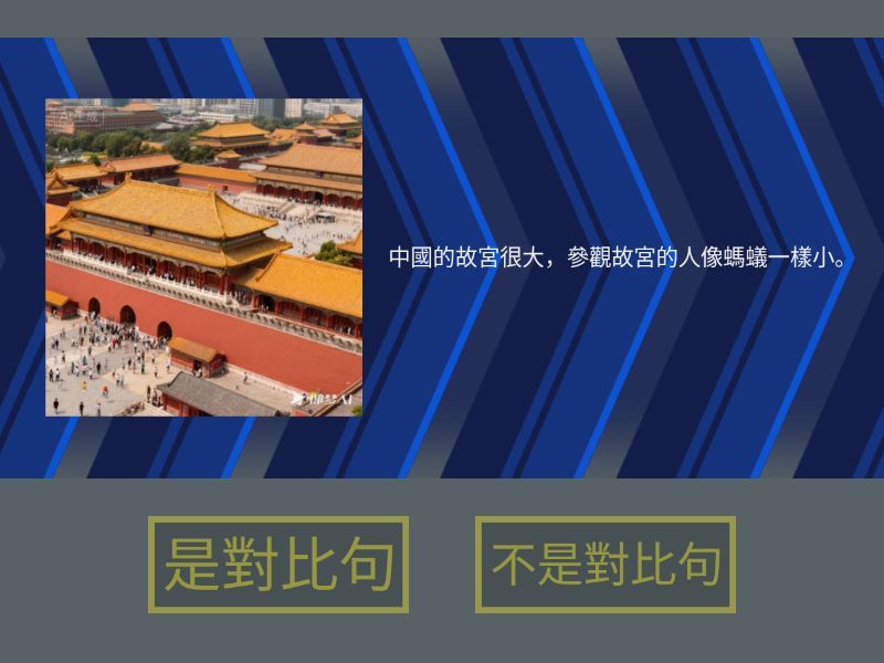 是對比句: 中國的故宮很大,參觀故宮的人像螞蟻一樣小。, 今天,英文功課多,中文功課少。, 火車開得很慢,中國的高鐵開得很快。, 我們應該做好事,不能做壞事。, 寫字的時候,「點」很短,「捺」很長。, 姐姐很高,弟弟很矮。, 妹妹拿來的羽毛很輕,哥哥搬來的西瓜很重。, 和平的中國很安全,打仗的國家很危險。, 我們應該保持課室乾淨,不應該將課室弄得骯髒。, 不是對比句: 下雨了,大大小小的雨點從天上落下。, 爸爸問:「這個書包多少錢?」, 體育老師説:「今天我們練習快慢跑。」, 警察捉到了好多壞人。, 我們可以用尺子度長短。,