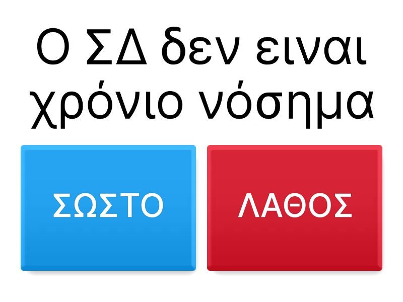1) Ο ΣΔ δεν ειναι χρόνιο νόσημα a) ΣΩΣΤΟ b) ΛΑΘΟΣ 2) Ο ΣΔ τύπου 1 εμφανίζεται σε νέους σε ηλικία ανθρώπους. a) ΣΩΣΤΟ b) ΛΑΘΟΣ 3) Ο ΣΔ τύπου 2 ονομάζεται και διαβήτης ενηλίκων. a) ΣΩΣΤΟ b) ΛΑΘΟΣ 4) Στην διαβητική οξέωση έχουμε μείωση της γλυκόζης στο αίμα. a) ΣΩΣΤΟ b) ΛΑΘΟΣ