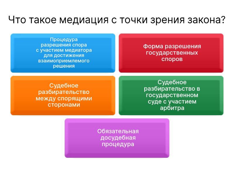1) Что такое медиация с точки зрения закона? a) Процедура разрешения спора с участием медиатора для достижения взаимоприемлемого решения b) Форма разрешения государственных споров c) Судебное разбирательство между спорящими сторонами d) Судебное разбирательство в государственном суде с участием арбитра e) Обязательная досудебная процедура 2) Кто такой медиатор? a) Независимое лицо, привлекаемое сторонами b) Беспристрастное лицо, не заинтересованное в исходе дела и выбранное по соглашению сторон c) Государственный служащий d) Представитель сторон спора e) Судебный пристав 3) Кто является участниками медиации? a) Медиатор и стороны медиации b) Юридические и физические лица c) Стороны d) Физические лица e) Потерпевшие 4) На какой основе осуществляется деятельность медиаторов? a) Профессиональная и общественная основа b) Политическая основа c) Экономическая основа d) Профсоюзная основа e) Юридическая основа 5) Кто такой медиатор? a) Независимое лицо, назначенное сторонами для проведения медиации b) Общественный эксперт c) Арбитр d) Гражданский судья e) Психолог, назначенный для определения проблемы 6) Какое утверждение относительно применения медиации в спорах верно? a) Медиация возможна как до, так и после судебного разбирательства b) Судьи могут принудить стороны к медиации c) Медиация возможна только до судебного разбирательства d) Медиация применяется только в гражданских делах e) Медиация применяется во всех уголовных делах 7) Основная цель медиатора: a) Преодоление препятствий на пути к достижению соглашения, внесению изменений и заключению сделок b) Познакомить стороны друг с другом, узнать друг друга c) Определить потребности сторон, выявить их интересы. d) Провести анализ проблемы и разработать возможные альтернативные решения e) Ускорить процесс переговоров. 8) Метод предотвращения и разрешения конфликта, заключающийся в использовании ненасильственных средств и методов для совместного разрешения проблемы, относится к следующему понятию: a) Переговоры b) Медиация c) Манипуляция d) Шантаж e) Разбирательство 9) В каких случаях медиация наиболее востребована? a) Когда необходимо учесть интересы многих сторон b) Когда существует только одна точка зрения c) Когда необходимо восстановить межличностные отношения d) Если достаточно желания хотя бы одной из сторон e) Когда нет конфликта 10) Интересы на переговорах: a) Причины и мотивы вступления сторон в переговоры b) Совокупность целей, предложений, аргументов и возможные решения, которые стороны согласуют c) Методы воздействия на партнера в ходе переговоров d) План переговоров e) Стиль переговоров 11) Позиция на переговорах: a) Причины и мотивы вступления сторон в переговоры b) Совокупность целей, предложений, аргументов и возможные решения, которые стороны согласуют c) Методы воздействия на партнера в ходе переговоров d) План переговоров e) Стиль переговоров 12) Медиация нацелена на выработку стабильного решения, отвечающего глубинным интересам обеих сторон, следовательно, оно должно быть найдено… a) самими сторонами b) медиатором c) судьей d) совместно с близкими родственниками e) совместно с органами исполнительного комитета 13) Установление контакта медиатора со сторонами и вступление в управление процедурой путем введения процедурных правил, по которым будет строиться общение участников медиации и и