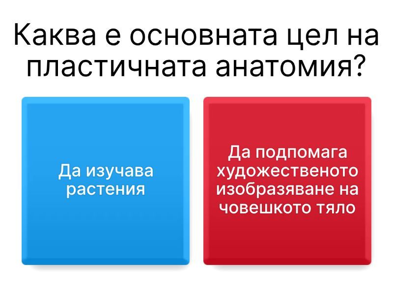 1) Каква е основната цел на пластичната анатомия? a) Да изучава растения b) Да подпомага художественото изобразяване на човешкото тяло