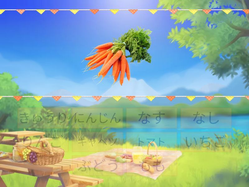 にんじん, きゅうり, トマト, キャベツ, なす, なし, りんご, ぶどう, もも, いちご,