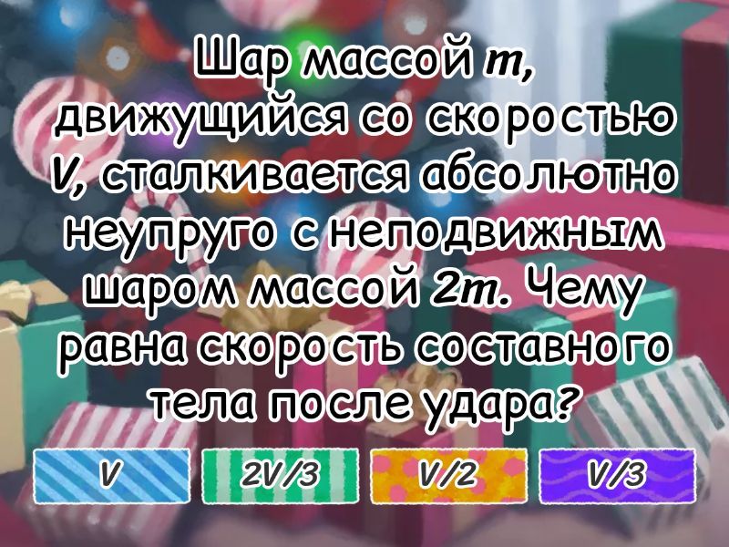 1) Шар массой m, движущийся со скоростью V, сталкивается абсолютно неупруго с неподвижным шаром массой 2m. Чему равна скорость составного тела после удара? a) V b) 2V/3 c) V/2 d) V/3 2) Два шара с равными массами движутся навстречу друг другу с одинаковыми по модулю скоростями и сталкиваются абсолютно упруго. Что произойдет с их скоростями после такого столкновения? a) Остановятся b) Двигаться вместе c) Обменяются скоростями d) Разлетятся в стороны 3) Ракета, находящаяся в космосе, выбрасывает реактивную струю газов. Скорость истечения газов относительно ракеты равна U. Что произойдет с импульсом системы «ракета + газы»? a) Уменьшится b) Останется неизменным c) Увеличится d) Сначала увеличится 4) При абсолютно неупругом ударе двух тел, движущихся навстречу друг другу, их общая кинетическая энергия после удара... a) Станет меньше b) Будет больше c) Превратится в энергию d) Останется такой же 5) На неподвижную тележку массой M прыгает человек массой m со скоростью v, направленной горизонтально, и цепляется за нее. Какую скорость приобретет тележка с человеком? a) v * (m+M)/m b) v * M/(m+M) c) v * (m+M)/M d) v * m/(m+M)