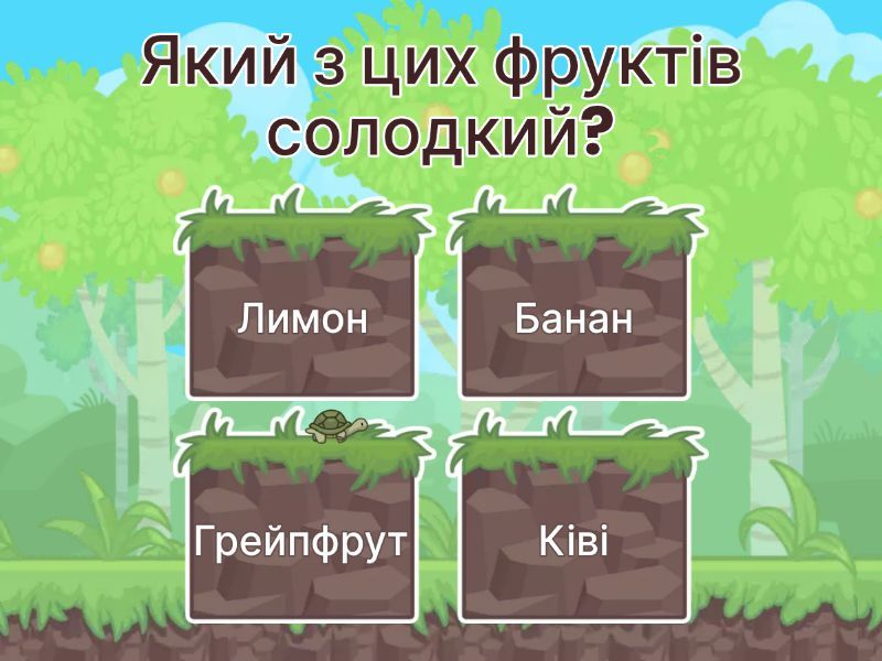 1) Який з цих фруктів солодкий? a) Лимон b) Банан c) Грейпфрут d) Ківі 2) Який овоч має гіркий смак? a) Морква b) Капуста c) Картопля d) Цибуля 3) Яка ягода кисла на смак? a) Полуниця b) Чорниця c) Журавлина d) Малина 4) Який фрукт має кисло-солодкий смак? a) Яблуко b) Банан c) Груша d) Персик 5) Який овоч зазвичай солодкий? a) Кабачок b) Цибуля c) Часник d) Буряк 6) Яка ягода має солодкий смак? a) Чорниця b) Журавлина c) Агрус d) Калина 7) Який фрукт має гіркий присмак? a) Апельсин b) Грейпфрут c) Мандарин d) Лайм 8) Який овоч має солодкий смак? a) Цибуля b) Баклажан c) Морква d) Капуста 9) Яка ягода має терпкий смак? a) Агрус b) Чорниця c) Малина d) Калина 10) Який фрукт має солодкий смак? a) Лимон b) Груша c) Ківі d) Апельсин