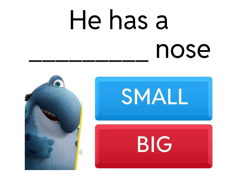 1) He has a _________ nose a) SMALL b) BIG 2) She has ________ hair a) LONG b) SHORT 3) He has __________ hair a) LONG b) SHORT 4) She has a ________ head a) SMALL b) BIG 5) He has ________ hair a) SHORT b) LONG 6) She has _________ hair a) LONG b) SHORT 7) He has __________ ears a) SMALL b) BIG 8) He has a __________ mouth a) BIG b) SMALL 9) She has __________ eyes a) SMALL b) BIG 10) She has ____________ eyes a) SMALL b) BIG 11) He has _____________ ears a) SMALL b) BIG 12) He has ____________ hair a) LONG b) SHORT