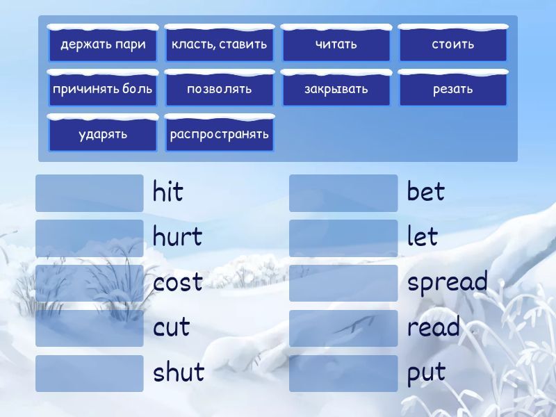 держать пари - bet, стоить - cost, резать - cut, ударять - hit, причинять боль - hurt, позволять - let, класть, ставить - put, читать - read, закрывать - shut, распространять - spread,