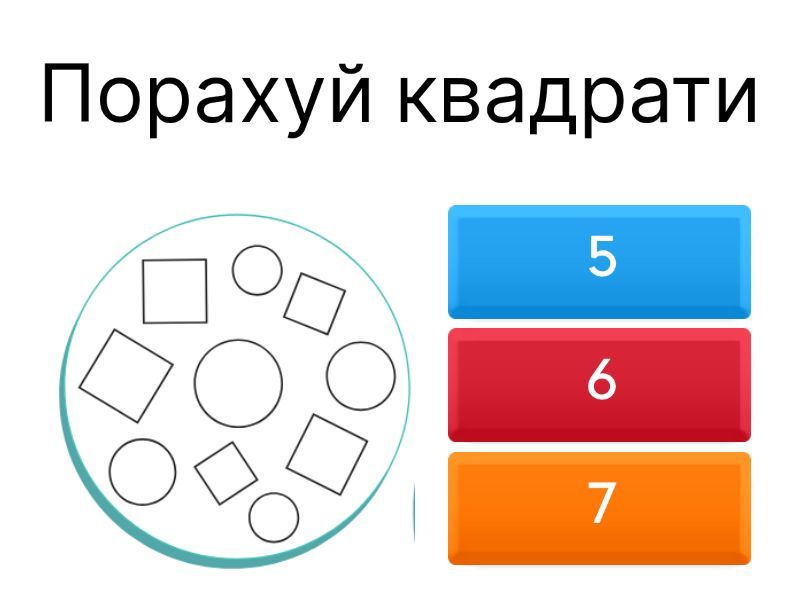 1) Порахуй квадрати a) 5 b) 6 c) 7 2) Порахуй квадрати a) 6 b) 7 c) 8 3) Порахуй прямокутники a) 3 b) 2 c) 5 4) Порахуй прямокутники a) 7 b) 5 c) 6 5) Порахуй квадрати a) 6 b) 5 c) 7