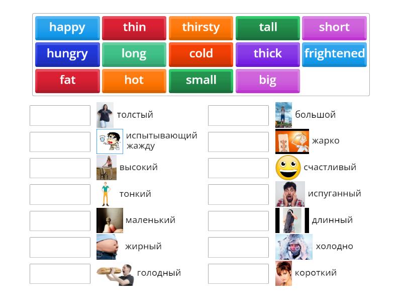 cold - холодно, hot - жарко, hungry - голодный, thirsty - испытывающий жажду, happy - счастливый, frightened - испуганный, fat - жирный, thin - тонкий, short - короткий, tall - высокий, big - большой, small - маленький, long - длинный, thick - толстый,