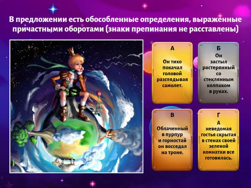 1) В предложении есть обособленные определения, выраженные причастными оборотами (знаки препинания не расставлены) a) Он тихо покачал головой разглядывая самолет. b) Он застыл растерянный со стеклянным колпаком в руках. c) Облаченный в пурпур и горностай он восседал на троне. d) А неведомая гостья скрытая в стенах своей зеленой комнатки все готовилась. 2) В предложении есть обособленные обстоятельства, выраженные деепричастными оборотами (знаки препинания не расставлены) a) Потерпев неудачу с рисунками No1 и No2 я утратил веру в себя. b) Король повел рукою скромно указывая на свою планету а также и на другие планеты. c) А этот пророс однажды из зерна занесенного неведомо откуда... d) И Маленький принц отправился дальше растерянный и недоумевающий. 3) Знаки препинания расставлены верно в предложениях a) Заслышав людские шаги, я всегда убегаю и прячусь. b) И ворот заскрипел, точно старый флюгер долго ржавевший в безветрии. c) И скорый поезд, сверкая, освещенными окнами, с громом промчался мимо. d) И прогремел, сверкая, третий скорый поезд. 4) Знаки препинания расставлены верно в предложениях a) Нащупывая в кармане револьвер, я бегом бросился к ней. b) Маленький принц не сводил глаз с крохотного ростка, не похожего на все остальные ростки и былинки. c) У подножья стены подняв голову к Маленькому принцу, свернулась желтая змейка. d) Человек, потерпевший кораблекрушение, и затерянный на плоту посреди океана, был бы не так одинок. 5) Обособленные второстепенные члены есть в предложениях (знаки препинания не расставлены) a) На пятый день опять-таки благодаря барашку я узнал секрет Маленького принца. b) Тут он снова загрустил вспоминая свою покинутую планету. c) Рассказывая о фонарщиках я несколько погрешил против истины. d) Засветив свои огни они отправлялись спать.