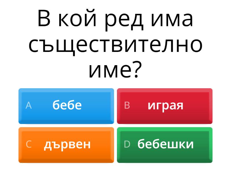 1) В кой ред има съществително име? a) бебе b) играя c) дървен d) бебешки 2) Къде откривате само прилагателните имена? a) весел, бърз, спортист b) млад, спортен, детски c) зелен, дървен, красавец 3) В кой ред има само глаголи? a) дебелея, дебел b) душене, душа c) мисля, моля се 4) В кое изречение няма прилагателно име? a) Мечката спи ли зимен сън? b) Ваня бяга бързо. c) Какво бързо животно! 5) В кой ред всички прилагателни имена са написани правилно? a) загрижена, есенна b) лесни, пролетнна c) хладна, страна