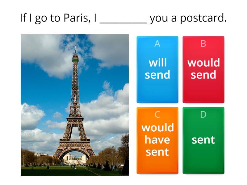 1) If I go to Paris, I __________ you a postcard.  a) will send b) would send c) would have sent d) sent 2) If you drop ice in water, it __________. a) floated b) floats c) would have floated 3) If I lived by the beach, I _______ swimming every day. a) would go b) went c) will go d) would have gone 4) If you had booked tickets, we _____________ home. a) won't have stayed b) wouldn't have stayed c) stayed d) will stay 5) If I were you, I ______________ those lies. a) won't believe b) will believe c) wouldn't believe d) believed 6) If you had been honest from the start, none of this __________. a) will happen b) happened c) won't happen d) would have happened 7) We woudn't have got lost, if we _________________ the map. a) have taken b) had taken c) took d) will take 8) You would feel much better if you ____________so much time on the computer and ________ less junk food.  a) didn't spend /ate b) spent / ate c) spend/ eat d) don't spend/ eat 9) If I don't get a good mark in the maths test, I ________ annoyed and I __________ an Iphone for my birthday. a) would be/ wouldn't get b) was / didn' t get c) am/get d) Will be/ won't get 10) If I had a car, I _____________ by tram.  a) would travel b) woudn't travel c) will travel d) would have travelled 11) If she had become a musician, she ____________ an album by now.  a) will record b) recorded c) would have recorded d) would record 12) If people drove electric cars, we _______________ so much petrol and the air __________ cleaner. a) wouldn't use/would be b) won't use/ will be c) would use/ would be d) used/ was 13) If I had musical talent, I ________ to play the guitar. a) would learn b) will learn c) learnt d) would have learnt