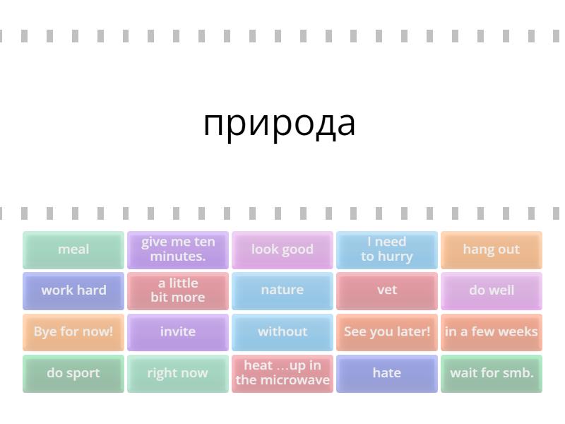 nature - природа, vet - ветеринар, hang out - зависать, тусоваться, wait for smb. - ждать кого- то, look good - выглядеть хорошо, work hard - работать усердно, right now - прямо сейчас, See you later! - увидимся позже., give me ten minutes. - дай мне 10 минут., I need to hurry - мне нужно поторопиться, a little bit more - немного больше, Bye for now! - до встречи!, do sport - заниматься спортом, do well - выступить хорошо, учиться хорошо, hate - ненавидеть, meal - прием пищи, in a few weeks - через несколько недель , invite - пригласить, without - без, heat …up in the microwave - подогреть в микроволновке,