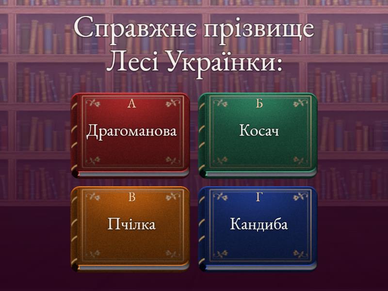 1) Справжнє прізвище Лесі Українки: a) Драгоманова b) Косач c) Пчілка d) Кандиба 2) Назва вірша «Contra spem spero!» Лесі Українки в перекладі з латини означає: a) боротися до кінця; b) мовчати — кричати; c) думки проти течії. d) без надії сподіваюсь 3) У вірші «Contra spem spero» Леся Українка використала давньогрецький міфологічний образ: a) Сізіфа b) Зевса c) Прометея d) Аріадни 4) Назвіть характерний для письма Лесі Українки творчий метод, що полягає в поєднанні гармонії ідеалу з життєвою правдою. a) неокласицизм b) неоромантизм c) неореалізм d) експресіонізм 5) Жанр твору "Лісова пісня": a) новела b) повість c) драма - феєрія d) роман 6) Головні герої твору "Лісова пісня": a) Іван та Марічка b) Мавка та Лукаш c) Лаврін та Мелашка d) Наталка та Григорій 7) Мавці у творі протиставляється: a) Килина b) Дядько Лев c) Перелесник d) Русалка 8) Скільки днів Леся Українка писала "Лісову пісню"? a) 10-12 днів b) 10-12 місяців c) 2 роки d) 2 дні 9) Твір "Лісова пісня" складається з : a) 10 частин b) 9 частин c) прологу і 3 дій d) прологу і 8 дій 10) На що перетворюється головна героїня твору "Лісова пісня"? a) на вербу b) на тополю c) на дуба d) на ясеня 11) Як ще називають Лесю Українку? a) Буковинською горлицею b) Королевою поезії c) Дочкою Прометея d) Майстром реалістичної прози 12) Слова "Ні! Я жива! Я буду вічно жити!/ Я в серці маю те, що не вмирає" належать: a) Килині b) Матері Лукаша c) Русалці d) Мавці