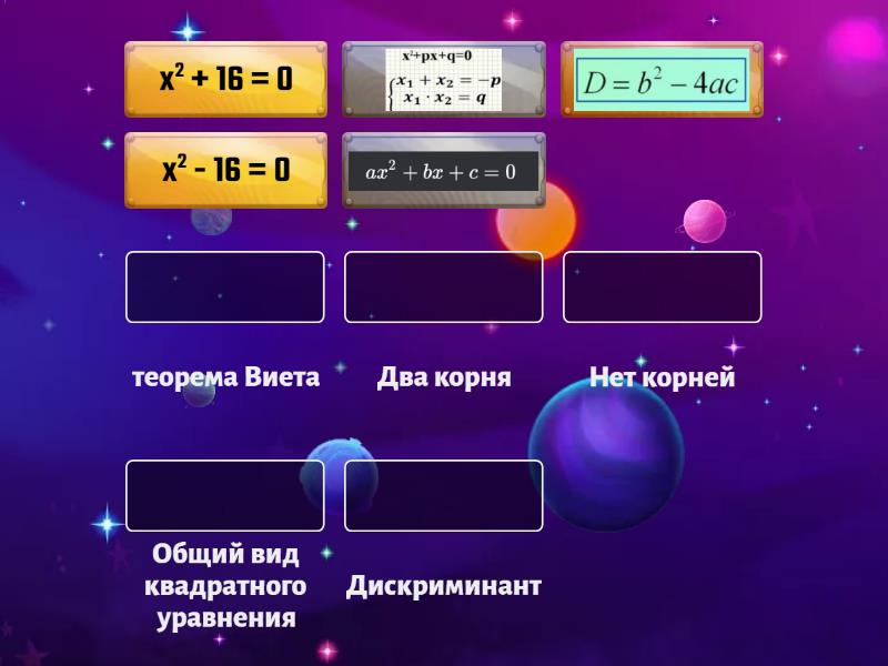 Общий вид квадратного уравнения, Дискриминант, теорема Виета, x2 + 16 = 0 - Нет корней, x2 - 16 = 0 - Два корня,