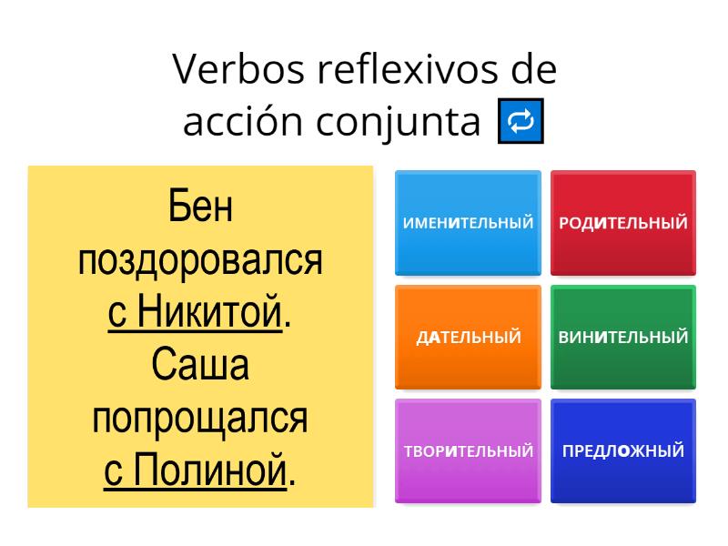 1) Sujeto de la frase (кто? что?) a) ИМЕНИТЕЛЬНЫЙ b) РОДИТЕЛЬНЫЙ c) ДАТЕЛЬНЫЙ d) ВИНИТЕЛЬНЫЙ e) ТВОРИТЕЛЬНЫЙ f) ПРЕДЛОЖНЫЙ 2) Lo que se posee (у кого есть что?) a) ИМЕНИТЕЛЬНЫЙ b) РОДИТЕЛЬНЫЙ c) ДАТЕЛЬНЫЙ d) ВИНИТЕЛЬНЫЙ e) ТВОРИТЕЛЬНЫЙ f) ПРЕДЛОЖНЫЙ 3) Lo que nos gusta (кому нравится что?) a) ИМЕНИТЕЛЬНЫЙ b) РОДИТЕЛЬНЫЙ c) ДАТЕЛЬНЫЙ d) ВИНИТЕЛЬНЫЙ e) ТВОРИТЕЛЬНЫЙ f) ПРЕДЛОЖНЫЙ 4) Complemento del Nombre (чей? чья? чьё? чьи?) a) ИМЕНИТЕЛЬНЫЙ b) РОДИТЕЛЬНЫЙ c) ДАТЕЛЬНЫЙ d) ВИНИТЕЛЬНЫЙ e) ТВОРИТЕЛЬНЫЙ f) ПРЕДЛОЖНЫЙ 5) Pertenencia (у кого есть что?) a) ИМЕНИТЕЛЬНЫЙ b) РОДИТЕЛЬНЫЙ c) ДАТЕЛЬНЫЙ d) ВИНИТЕЛЬНЫЙ e) ТВОРИТЕЛЬНЫЙ f) ПРЕДЛОЖНЫЙ 6) Negación o carencia (нет кого? нет чего?) a) ИМЕНИТЕЛЬНЫЙ b) РОДИТЕЛЬНЫЙ c) ДАТЕЛЬНЫЙ d) ВИНИТЕЛЬНЫЙ e) ТВОРИТЕЛЬНЫЙ f) ПРЕДЛОЖНЫЙ 7) Procedencia (откуда?) a) ИМЕНИТЕЛЬНЫЙ b) РОДИТЕЛЬНЫЙ c) ДАТЕЛЬНЫЙ d) ВИНИТЕЛЬНЫЙ e) ТВОРИТЕЛЬНЫЙ f) ПРЕДЛОЖНЫЙ 8) Circunstancial de lugar (persona🕴️) (у кого?) a) ИМЕНИТЕЛЬНЫЙ b) РОДИТЕЛЬНЫЙ c) ДАТЕЛЬНЫЙ d) ВИНИТЕЛЬНЫЙ e) ТВОРИТЕЛЬНЫЙ f) ПРЕДЛОЖНЫЙ 9) Numerales y palabras de cantidad (много, мало, сколько, 2, 3, 4, 5-20...) a) ИМЕНИТЕЛЬНЫЙ b) РОДИТЕЛЬНЫЙ c) ДАТЕЛЬНЫЙ d) ВИНИТЕЛЬНЫЙ e) ТВОРИТЕЛЬНЫЙ f) ПРЕДЛОЖНЫЙ 10) Complemento Indirecto (кому? чему?) a) ИМЕНИТЕЛЬНЫЙ b) РОДИТЕЛЬНЫЙ c) ДАТЕЛЬНЫЙ d) ВИНИТЕЛЬНЫЙ e) ТВОРИТЕЛЬНЫЙ f) ПРЕДЛОЖНЫЙ 11) Verbo нравиться (кому нравится что?) a) ИМЕНИТЕЛЬНЫЙ b) РОДИТЕЛЬНЫЙ c) ДАТЕЛЬНЫЙ d) ВИНИТЕЛЬНЫЙ e) ТВОРИТЕЛЬНЫЙ f) ПРЕДЛОЖНЫЙ 12) Dirección (persona 🏃‍♂️) (к кому?) a) ИМЕНИТЕЛЬНЫЙ b) РОДИТЕЛЬНЫЙ c) ДАТЕЛЬНЫЙ d) ВИНИТЕЛЬНЫЙ e) ТВОРИТЕЛЬНЫЙ f) ПРЕДЛОЖНЫЙ 13) Frases impersonales (adverbio) a) ИМЕНИТЕЛЬНЫЙ b) РОДИТЕЛЬНЫЙ c) ДАТЕЛЬНЫЙ d) ВИНИТЕЛЬНЫЙ e) ТВОРИТЕЛЬНЫЙ f) ПРЕДЛОЖНЫЙ 14) Edad (кому сколько лет?) a) ИМЕНИТЕЛЬНЫЙ b) РОДИТЕЛЬНЫЙ c) ДАТЕЛЬНЫЙ d) ВИНИТЕЛЬНЫЙ e) ТВОРИТЕЛЬНЫЙ f) ПРЕДЛОЖНЫЙ 15) Contenido a) ИМЕНИТЕЛЬНЫЙ b) РОДИТЕЛЬНЫЙ c) ДАТЕЛЬНЫЙ d) ВИНИТЕЛЬНЫЙ e) ТВОРИТЕЛЬНЫЙ f) ПРЕДЛОЖНЫЙ 16) Canal a) ИМЕНИТЕЛЬНЫЙ b) РОДИТЕЛЬНЫЙ c) ДАТЕЛЬНЫЙ d) ВИНИТЕЛЬНЫЙ e) ТВОРИТЕЛЬНЫЙ f) ПРЕДЛОЖНЫЙ 17) Complemento Directo (кого? что?) a) ИМЕНИТЕЛЬНЫЙ b) РОДИТЕЛЬНЫЙ c) ДАТЕЛЬНЫЙ d) ВИНИТЕЛЬНЫЙ e) ТВОРИТЕЛЬНЫЙ f) ПРЕДЛОЖНЫЙ 18) Dirección (куда? 📍) a) ИМЕНИТЕЛЬНЫЙ b) РОДИТЕЛЬНЫЙ c) ДАТЕЛЬНЫЙ d) ВИНИТЕЛЬНЫЙ e) ТВОРИТЕЛЬНЫЙ f) ПРЕДЛОЖНЫЙ 19) Circunstancia del Tiempo (días de la semana) a) ИМЕНИТЕЛЬНЫЙ b) РОДИТЕЛЬНЫЙ c) ДАТЕЛЬНЫЙ d) ВИНИТЕЛЬНЫЙ e) ТВОРИТЕЛЬНЫЙ f) ПРЕДЛОЖНЫЙ 20) Circunstancial de Tiempo (continuidad) a) ИМЕНИТЕЛЬНЫЙ b) РОДИТЕЛЬНЫЙ c) ДАТЕЛЬНЫЙ d) ВИНИТЕЛЬНЫЙ e) ТВОРИТЕЛЬНЫЙ f) ПРЕДЛОЖНЫЙ 21) Circunstancial de Tiempo (на какое время?) a) ИМЕНИТЕЛЬНЫЙ b) РОДИТЕЛЬНЫЙ c) ДАТЕЛЬНЫЙ d) ВИНИТЕЛЬНЫЙ e) ТВОРИТЕЛЬНЫЙ f) ПРЕДЛОЖНЫЙ 22) Verbo звать a) ИМЕНИТЕЛЬНЫЙ b) РОДИТЕЛЬНЫЙ c) ДАТЕЛЬНЫЙ d) ВИНИТЕЛЬНЫЙ e) ТВОРИТЕЛЬНЫЙ f) ПРЕДЛОЖНЫЙ 23) Instrumento de la Acción (чем?) a) ИМЕНИТЕЛЬНЫЙ b) РОДИТЕЛЬНЫЙ c) ДАТЕЛЬНЫЙ d) ВИНИТЕЛЬНЫЙ e) ТВОРИТЕЛЬНЫЙ f) ПРЕДЛОЖНЫЙ 24) Compañía (с кем? с чем?) a) ИМЕНИТЕЛЬНЫЙ b) РОДИТЕЛЬНЫЙ c) ДАТЕЛЬНЫЙ d) ВИНИТЕЛЬНЫЙ e) ТВОРИТЕЛЬНЫЙ f) ПРЕДЛОЖНЫЙ 25) Verbos reflexivos a) ИМЕНИТЕЛЬНЫЙ b) РОДИТЕЛЬНЫЙ c) ДАТЕЛЬНЫЙ d) ВИНИТЕЛЬНЫЙ e) ТВОРИТЕЛЬНЫЙ f) ПРЕДЛОЖНЫЙ 26) Verbos reflexivos de acción conjunta 🔁 a) ИМЕНИТЕЛЬНЫЙ b) РОДИТЕЛЬНЫЙ c) ДАТЕЛЬНЫЙ d) ВИНИТЕЛЬНЫЙ e) ТВОРИТЕЛЬНЫЙ f) ПРЕДЛОЖНЫЙ 27) Profesiones (работать / стать / быть кем?) a) ИМЕНИТЕЛЬНЫЙ b) РОДИТЕЛЬНЫЙ c) ДАТЕЛЬНЫЙ d) ВИНИТЕЛЬНЫЙ e) ТВОРИТЕЛЬНЫЙ f) ПРЕДЛОЖНЫЙ 28) Circunstancial de Tiempo (partes del día y estaciones del año) a) ИМЕНИТЕЛЬНЫЙ b) РОДИТЕЛЬНЫЙ c) ДАТЕЛЬНЫЙ d) ВИНИТЕЛЬНЫЙ e) ТВОРИТЕЛЬНЫЙ f) ПРЕДЛОЖНЫЙ 29) Circunstancial de lugar (где? 📍) a) ИМЕНИТЕЛЬНЫЙ b) РОДИТЕЛЬНЫЙ c) ДАТЕЛЬНЫЙ d) ВИНИТЕЛЬНЫЙ e) ТВОРИТЕЛЬНЫЙ f) ПРЕДЛОЖНЫЙ 30) Circunstancia del Tiempo (meses, semanas, años, siglos) a) ИМЕНИТЕЛЬНЫЙ b) РОДИТЕЛЬНЫЙ c) ДАТЕЛЬНЫЙ d) ВИНИТЕЛЬНЫЙ e) ТВОРИТЕЛЬНЫЙ f) 