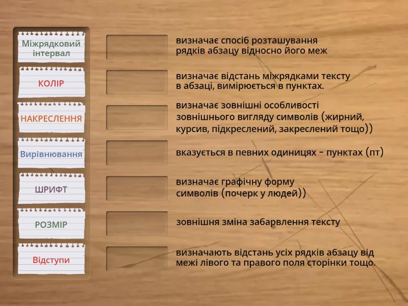 ШРИФТ - визначає графічну форму символів (почерк у людей)), РОЗМІР - вказується в певних одиницях - пунктах (пт), КОЛІР - зовнішня зміна забарвлення тексту , НАКРЕСЛЕННЯ - визначає зовнішні особливості зовнішнього вигляду символів (жирний, курсив, підкреслений, закреслений тощо)), Вирівнювання - визначає спосіб розташування рядків абзацу відносно його меж , Відступи - визначають відстань усіх рядків абзацу від межі лівого та правого поля сторінки тощо. , Міжрядковий інтервал - визначає відстань міжрядками тексту в абзаці, вимірюється в пунктах.,