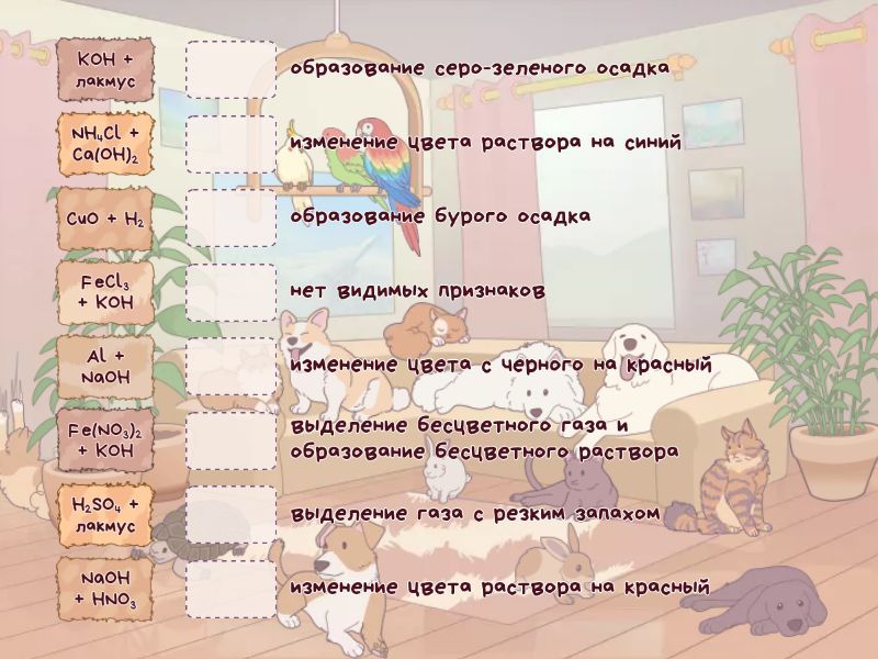 KOH + лакмус - изменение цвета раствора на синий, HCl + K2S - выделение газа с неприятным запахом, AgNO3 + CaBr2 - образование желтого осадка, NH4Cl + Ca(OH)2 - выделение газа с резким запахом, Cu(OH)2 + HCl - растворение осадка, Fe(NO3)2 + KOH - образование серо-зеленого осадка, H2SO4 + CaCO3 - выделение бесцветного газа без запаха, BaCl2 + Na2SO4 - образование белого осадка, NaOH + HNO3 - нет видимых признаков, СuCl2 + LiOH - образование голубого осадка, CuO + H2 - изменение цвета с черного на красный, FeCl3 + KOH - образование бурого осадка, H2SO4 + лакмус - изменение цвета раствора на красный, Zn + HNO3 конц - выделение бурого газа, Al + NaOH - выделение бесцветного газа и образование бесцветного раствора,