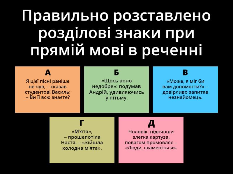 1) Розділові знаки для передачі чужої мови правильно вжито в реченні a) "Добрий вечір вам": заспівав позаду тоненький дівочий голос. b) "Ні, - сказав сам собі Василько - щуки я не піймаю, бо вона прудка". c) "Життя мені всміхалося, - говорив Франко, - а діти були промінням". d) "Коли я сита, то така я добра", ковтнувши жертву, промивала Кобра. e) Мама сказала: як же мені сумно, хочу побачити рідненьку сестру. 2) Розділові знаки при передачі чужої мови правильно вжито в реченні a) Літо в осені питає: де ти поділа журавлів. b) До булави треба голови!, казали запорожці. c) Ой казали, говорили по всім селі люди — «Та вже з того козаченька нічого не буде!» d) «Опізнився, небораче, одказав земляк йому, хто кохав життя ледаче, непереливки тому». e) «Дозвольте і мені, панове, річ держать!» — тут обізвалася Лисиця. 3) Розділові знаки при передачі чужої мови правильно вжито в реченні a) «За що ж, хто-небудь попитає, Зозуля Півня вихваляє?». b) «Та чим же я вам досадив?» ягнятко, плачучи, питає. c) Яка ти розкішна, земле, — думала Маланка. d) Мати через пліт запитала сина, куди він зібрався. e) Жалібно жовте листя березини, здається, шепче, «Літо, де ти, літо?». 4) Граматичну помилку допущено в реченні a) Оксана довго міркувала, що подарувати сестрі на день народження. b) Учень, який ретельно підготував доповідь, успішно відповів на всі запитання. c) Можна сподіватися на те, що концерт Патрісії Каас в Україні ще відбудеться. d) Водій автобуса сказав пасажирам, які щойно зайшли, що оплатіть проїзд. e) У виступі головним було те, що демократичні цінності слід відстоювати. 5) Правильно розставлено розділові знаки при прямій мові в реченні a) Я цієї пісні раніше не чув, – сказав студентові Василь: – Ви її всю знаєте? b) «Щось воно недобре»: подумав Андрій, удивляючись у пітьму. c) «Може, я міг би вам допомогти?» – довірливо запитав незнайомець. d) «М’ята», – прошепотіла Настя. – «Зійшла холодна м’ята». e) Чоловік, піднявши злегка картуза, повагом промовляє – «Люди, схаменіться». 6) Речення з прямою мовою записано в рядку (розділові знаки пропущено) a) Хай замріяна весна тобі розкаже як вірно я тебе кохаю. b) Ні не клич мене весно казала я їй не чаруй і не ваб надаремне. c) А жовте листя осені шепоче щоб швидко-швидко йшла вже геть. d) Хто вам сказав що я слабка що я корюся долі? 7) Правильно розставлено розділові знаки при прямій мові в реченні a) «Може, у цій лісовій хатинці ховається зараз Мавка» – подумалось мені. b) Мені сказав розумний садівник: «Коли пересаджуєш дерево, роби це з любов’ю». c) «Краса і мудрість – писав Еріх – не розкіш, не привілей, а радість, дарована всьому світу». d) Мирослав Дочинець радить – «Не виставляй напоказ усе, що маєш, – завтра вже нікого не здивуєш». e) «Стерегти ліс», – сказав Харитон – «треба не рушницею, а любов’ю». 8) НЕПРАВИЛЬНО розставлено розділові знаки при прямій мові в реченні a) «Життя лише доти має вартість, – говорив батько частенько – доки людина може допомагати іншим». b) «Поки людина жива, вона ніколи не повинна втрачати надії», – говорив давньоримський філософ Сенека. c) «Це ж хто сказав, що одна ластівка не робить весни?» – переможно вигукнув Таран. d) Давньогрецький філософ Епікур казав: «Якщо доля особливо прихильна до людини, вона дає їй вірних друзів». e) «Розумні люди говорять тому, що їм є що сказати, – стверджував мудрець і додавав: – А дурні просто хочуть сказати хоч 