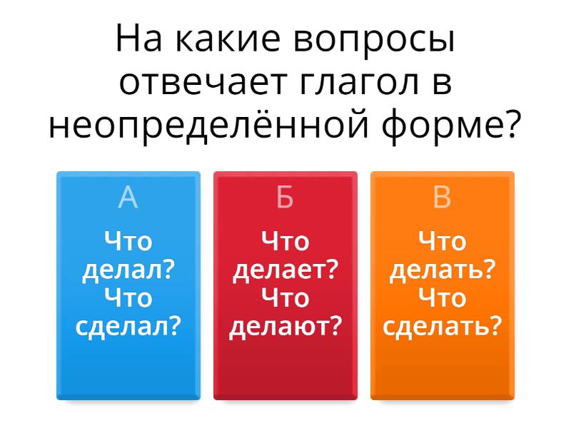 1) На какие вопросы отвечает глагол в неопределённой форме? a) Что делал? Что сделал? b) Что делает? Что делают? c) Что делать? Что сделать? 2) Какого времени глагол неопределённой формы? a) Прошедшего времени b) Будущего времени c) Настоящего времени d) Время не определяется 3) Найти глагол в неопределённой форме a) рисую b) тушить c) смеялся 4) На что оканчивается глагол в неопределённой форме? a) – ешь, - ишь b) – ете, - ите c) – ть, - ти