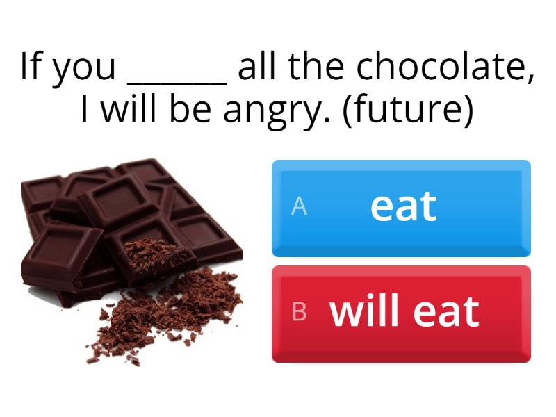 1) If you ______ all the chocolate, I will be angry. (future) a) eat b) will eat 2) If you ______ too much, you get sick. (always) a) eat b) will eat 3) When it rains, I ________ my umbrella (always) a) bring b) will bring 4) If she _______ the bus, she'll be late. (future) a) misses b) will miss 5) If you ______ a computer, you can do your homework faster. (always) a) have b) will have c) having 6) If you _______ your keys, you will not be able to unlock the door. (future) a) will lose b) lose 7) If it very _____ cold, the water freezes. (always) a) will be b) is 8) When I go to bed late, I _____ tired in the morning. (always) a) will feel b) feel 9) If you study English every day, you ________! (future) a) improves b) will improve 10) If you leave me, I _______ mad! (future) a) am b) will be 11) If I lose my friends, I _________ devastated! (future) a) am b) will be 12) She will be happy if you _____________her a new phone. (future) a) buy b) will buy 13) He will go out if you ______________ him. (future) a) ask b) will ask 14) They are sad if they ________________ alone. (always) a) are b) will be 15) Bunnies run fast if they ________ scared. (always) a) are b) will be 16) If they ___________ hungry, lambs eat grass. (always) a) are b) will be