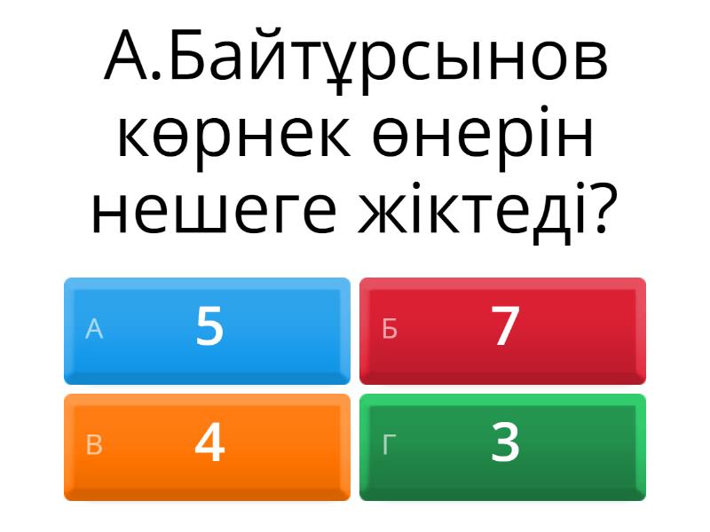 1) А.Байтұрсынов көрнек өнерін нешеге жіктеді? a) 5 b) 7 c) 4 d) 3 2) Оқушыға өнерді эмоциялық-эстетикалық тұрғыдан түсінуге үйрететін сабақ түрі? a) Жазба әдебиет b) Лирика сабағы c) Сахналық өнер d) Көркем әдебиет 3) 5-8 сынып оқушыларының көбін қызықтыратын шығарма түрі? a) Поэзия b) Лирика c) Проза d) драма 4) Лириканың жекелеген компоненттерін көрсетіңіз? a) Образ, композиция, идея b) Сын,тарих,жыр c) Поэтика, поэма d) Драма, идея, тақырып 5) «Лириканы оқытудың басты мақсаты- оқушыны поэзияны сүюге, эстетикалық ләззат ала білуге баулу» -деген пікірдің авторы? a) А.Байтұрсынұлы b) Қ.Бітібаева ДҰРЫС c) Б.Д.Жұмақаева d) e) Т.М. Жоламанова 6) «Лирика – поэзияның жаны»– деп пікір білдірген ғалым? a) В. Г. Белинский b) К. Әбілқасымова  c) В.В.Голубков d) М.А.Рыбникова 7) «Орта мектепте лириканы оқыту» атты оқу құралын жариялаған ғалымдар? a) Ж.Нұрмаханов, Ә.Дайырова ДҰРЫС b) Н.Дөкенова, Б.Д. Жұмақаева c) Г.Құрманбаева, Д.С.Аңсабаев d) Ә.Дайырова, Г.Құрманбаева 8) Т.Ф.Қурдюшева орта мектеп іс-тәжірибесіндегі көркем шығармаларды қабылдаудың тиімділік әсерін нешеге кезеңге бөліп қарастырады? a) 2 b) 4 c) 6 d) 5 9) «Абай Құнанбаев шығармаларын қазақ мектептерінің 5-8 сыныптарында оқыту әдістемесі» зерттеу еңбегінің авторы? a) Б.Д. Жұмақаева b) Д.С. Аңсабаев  c) Г.Құрманбаева d) Н.Дөкенова 10) Әдебиетті оқыту әдістемесі ғылымында классикалық әдістердің бірі саналатын шығармашылық оқыту әдісінің бір тәсілі? a) көркем мәтінді мәнерлеп оқу b) қабылдауға дайындық c) мәтінді оқытудан кейін қалыптасатын қабылдау d) көркем шығарманы сөйлету 11) Я.А.Коменский оқу үдерісіндегі оқушыға білім мен тәрбие беру жұмы- сын мынадай кезеңге бөледі: a) 2 b) 5 c) 4 d) 3 12) Қазақ фольклорының тарихына арналған «Қазақ әдебиеті» (1932) кітабын кім жазды? a) Қажым Жұмалиев b) Сәбит Мұқанов c) Мұхтар Әуезов d) Сәкен Сейфуллин 13) Лирикалық шығармаларды оқытуда жиі қолданылатын әдіс: a) Мәнерлеп оқу әдісі Дұрыс b) Көрнекілік әдісі  c) Репродуктивтік әдіс  d) Ішінара баяндау әдісі 14) Қазақ әдебиетін оқыту – ғылым ретінде дамуын мына бағытта зерттейді: a) Мектеп жүйесі. b) Тіл құрылысы. c) Әдеби дамытушылық. d) Ғылыми-әдеби эксперимент 15) Қазақ әдебиетін оқыту өз алдынк қандай мақсаттар қояды? a) Тәрбиелік; Дидактикалық; Білімділік. b) Тілдік; Әдебиеттік, Дамытушылық. c) Танымдық; Дамытушылық; Тәрбиелік. d) Танымдық; Тілдік; Дамытушылық