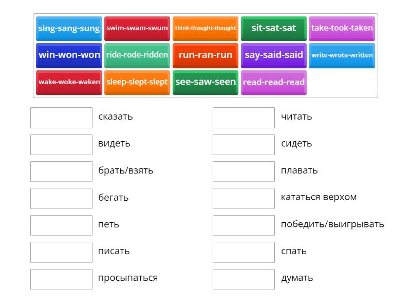 read-read-read - читать, ride-rode-ridden - кататься верхом, run-ran-run - бегать, say-said-said - сказать, see-saw-seen - видеть, sing-sang-sung - петь , sit-sat-sat - сидеть, sleep-slept-slept - спать, swim-swam-swum - плавать, wake-woke-waken - просыпаться, take-took-taken - брать/взять, think-thought-thought - думать, win-won-won - победить/выигрывать, write-wrote-written - писать,