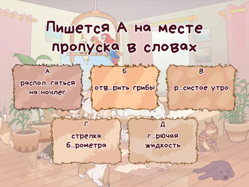 1) Пишется А на месте пропуска в словах a) распол...гаться на ночлег b) отв...рить грибы c) р...систое утро d) стрелка б...рометра e) г...рючая жидкость 2) Пишется Е на месте пропуска в словах: a) пр...вокзальная площадь b) вым...рающие животные c) подп...реть забор d) разносторонние увл...чение e) модный комб...незон 3) Двойные согласные пишутся в словах: a) ра(с/сс)плетать b) льня(н/нн)ая скатерть c) полирова(н/нн)ый d) те(л/лл)еконкурс e) бе(з/зз)вучный 4) Пишется О на месте пропуска с словах: a) достриж...т овец b) каблуч...к c) годовой отч...т d) с богач...м e) посвящ...н другу 5) Укажите номера пропусков, где пишется НИ: Как 1) н... гадали болельщики, кто станет победителем, 2)н...кто 3)н... ожидал такого поворота событий: лидер гонки упал перед финишной чертой, а бегущий следом 4)н... смог 5)н... помочь сопернику. a) 1 b) 2 c) 3 d) 4 e) 5 6) Пишется НЕ раздельно со словами: a) (не)начало, а конец игры b) (не)понимая происходящего c) (не)высокая, но крутая гора d) (не)клюквенный напиток e) очень (не)интересная статья 7) Какую букву или сочетание букв следует писать на месте пропуска в словосочетании: искус()но умела казаться умной a) т b) н c) ничего 8) Определите, в каком из выделенных слов есть орфографическая ошибка: a) участвовать в дискуссии b) плюшевый медвежонок c) известный полководец d) с районной администрацией e) сьестные припасы f) таёжная глушь 9) Найдите слово с орфографической ошибкой a) согревать землю b) побеги растений c) беспокойные жучки d) разискать цветы e) стали разбегаться насекомые