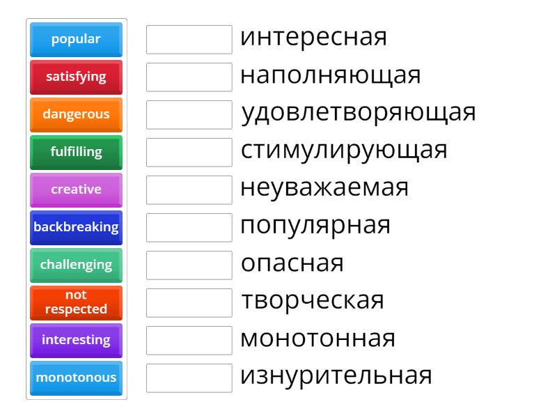 creative - творческая, challenging - стимулирующая, exciting - увлекательная, fulfilling - наполняющая, interesting - интересная, pleasant - приятная, popular - популярная, prestigious - престижная, satisfying - удовлетворяющая, skilful - квалифицированная, rewarding - вознаграждающая, backbreaking - изнурительная, boring - скучная, dangerous - опасная, exhausting - изматывающая, messy - беспорядочная, monotonous - монотонная, not respected - неуважаемая, tiring - утомительная,