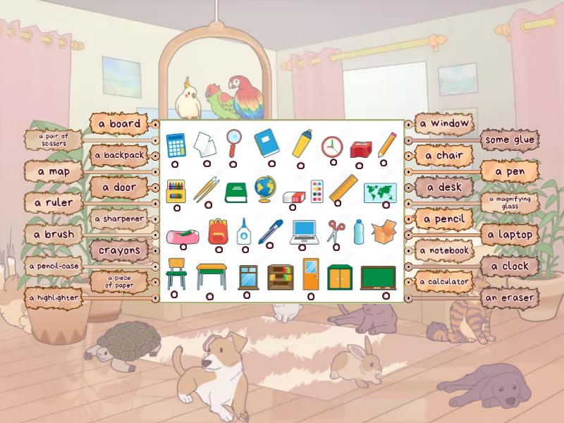 an eraser, a board, a door, a map, a brush, crayons, a calculator, a piece of paper, a magnifying glass, a sharpener, a clock, a pencil, a highlighter, a notebook, a pair of scissors, a desk, a chair, a backpack, a window, a pencil-case, some glue, a pen, a laptop, a ruler.