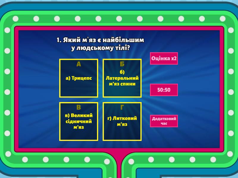 1) 1. Який м’яз є найбільшим у людському тілі? a) а) Трицепс b) б) Латеральний м'яз спини c) в) Великий сідничний м'яз d) г) Литковий м'яз 2) Скільки хвилин мінімально рекомендується займатися фізичною активністю для дорослих щотижня? a) а) 60 хвилин b) б) 150 хвилин c) в) 200 хвилин d) г) 300 хвилин 3) Який вид спорту є частиною Зимових Олімпійських ігор? a) а) Регбі b) б) Керлінг c) в) Плавання d) г) Волейбол