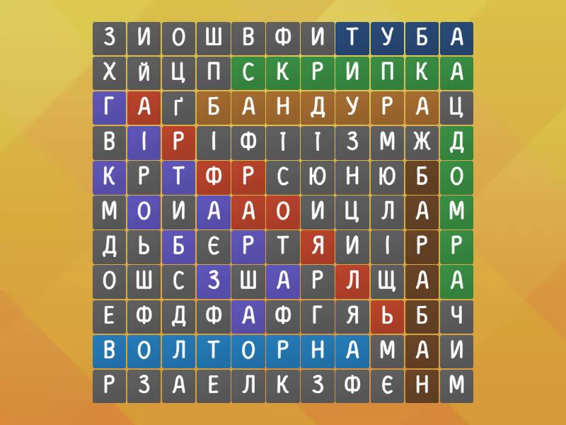 Домра, Гітара, Рояль, Волторна, Барабан, Туба, Бандура, Скрипка, Кобза, Арфа,