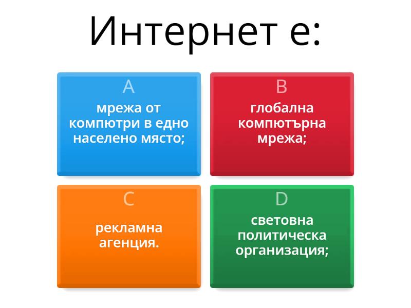 1) Коя от следните пароли за е-поща е силна a) 123456789 b) desi c) DeSi04@04@ d) 987654321 2) Как се нарича съвкупността от еднотипна информация, записана като едно цяло и имаща собствено име? a) папка b) файл c) браузър d) софтуер 3) Програмата за управление на папки и файлове се нарича: a) Mass Storage b) Microsoft Word c) Internet Explorer d) File Explorer 4) Интернет е: a) глобална компютърна мрежа; b) световна политическа организация; c) мрежа от компютри в едно населено място; d) рекламна агенция. 5) Кое от изброените е търсеща машина? a) Google Chrome; b) Microsoft Bing; c) Microsoft Edge; d) Mozilla Firefox. 6) С кой символ се обозначава прикачването на файл към е-съобщение при работа с е-поща? a) b) c) d) 7) Кой от следните е-адреси е правилен? a) ivan_dimitrov@abv.bg; b) ivan.dimitrov@gmailcom; c) иван.димитров@мейл.бг; d) ivan06*60@yahoo.com 8) Кое устройство НЕ Е входно? a) мишка; b) клавиатура; c) принтер; d) микрофон 9) Кой символ задължително трябва да се съдържа в електронния адрес? a) @ b) # c) * d) § 10) По какъв начин се осъществява търсенето, показано на фигурата: a) търсене по точна фраза b) търсене чрез изображения c) гласово въвеждане d) търсене с QR код 11) Коя от представените икони е на програмата Google Chrome? a) b) c) d) 12) Как се нарича програмата за разглеждане на уебстраница? a) уеббраузър (webbrowser) b) software c) Spam d) USB flash drive