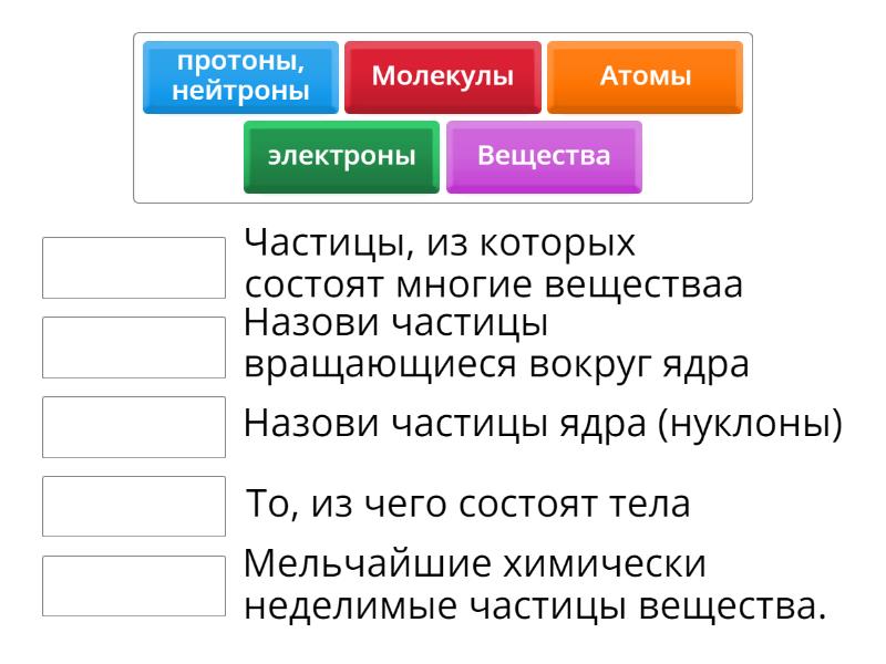 Атомы - Мельчайшие химически неделимые частицы вещества., Вещества - То, из чего состоят тела, Молекулы - Частицы, из которых состоят многие веществаа, протоны, нейтроны - Назови частицы ядра (нуклоны), электроны - Назови частицы вращающиеся вокруг ядра,