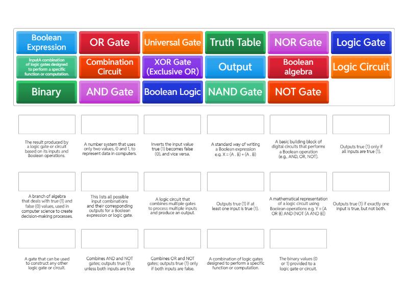 Boolean Logic - A branch of algebra that deals with true (1) and false (0) values, used in computer science to create decision-making processes., AND Gate - Outputs true (1) only if all inputs are true (1)., Logic Gate - A basic building block of digital circuits that performs a Boolean operation (e.g., AND, OR, NOT)., NOT Gate - Inverts the input value true (1) becomes false (0), and vice versa., Truth Table - This lists all possible input combinations and their corresponding outputs for a Boolean expression or logic gate., NOR Gate - Combines OR and NOT gates; outputs true (1) only if both inputs are false., Boolean Expression - A mathematical representation of a logic circuit using Boolean operations e.g. Y = (A OR B) AND (NOT (A AND B)), XOR Gate (Exclusive OR) - Outputs true (1) if exactly one input is true, but not both., Boolean algebra - A standard way of writing a Boolean expression e.g. X = (A . B) + (A . B), Binary - A number system that uses only two values, 0 and 1, to represent data in computers., NAND Gate - Combines AND and NOT gates; outputs true (1) unless both inputs are true, Logic Circuit - A combination of logic gates designed to perform a specific function or computation., InputA combination of logic gates designed to perform a specific function or computation. - The binary values (0 or 1) provided to a logic gate or circuit., OR Gate - Outputs true (1) if at least one input is true (1)., Output - The result produced by a logic gate or circuit based on its inputs and Boolean operations., Universal Gate - A gate that can be used to construct any other logic gate or circuit., Combination Circuit - A logic circuit that combines multiple gates to process multiple inputs and produce an output.,