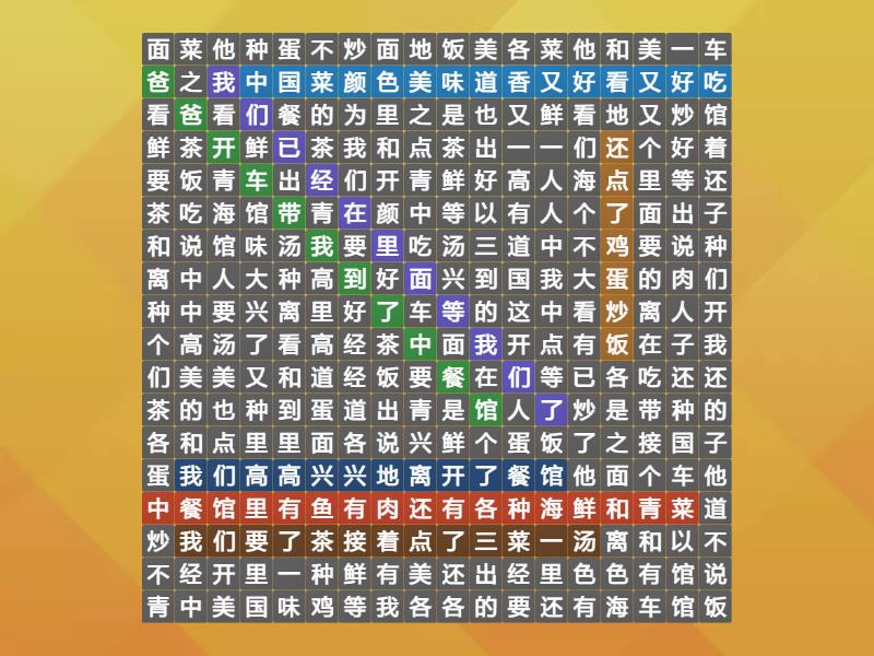 爸爸开车带我到了中餐馆, 我们已经在里面等我们了, 中餐馆里有鱼有肉还有各种海鲜和青菜, 中国菜颜色美味道香又好看又好吃, 我们要了茶,接着点了三菜一汤, 我们高高兴兴地离开了餐馆, 还点了鸡蛋炒饭,