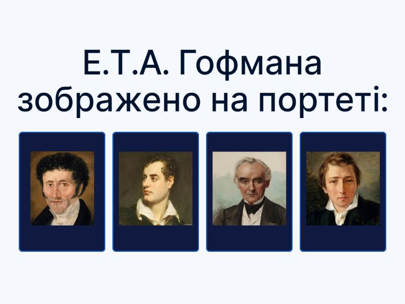 1) Е.Т.А. Гофмана зображено на портеті: a) b) c) d) 2) Батьківщина Е.Т.А.Гофмана - ... a) b) c) d) 3) Е.Т.А.Гофман - представник мистецтва... a) романтизму b) класицизму c) реалізму d) бароко 4) Твір "Малюк Цахес на прізвисько Цинобер" за жанром - повість-казка ... a) філософська b) сатирична c) пригодницька d) соціальна 5) Цинобра (кіновар) - це ... a) потвора b) карлик c) червона фарба d) дорогоцінний камінь 6) Події твору "Малюк Цахес..." відбуваються у князівстві... a) Керепес b) Ліхтенштейн c) Монако d) Андорра 7) Усіх персонажів Е.Т.А.Гофман поділяв на ... a) позитивних і негативних b) романтиків і реалістів c) ентузіастів і філістерів d) головних і другорядних 8) Філістер - це людина... a) духовно обмежена b) неосвічена c) аморальна d) дуже багата 9) Філістерами у творі "Малюк Цахес..." є... a) князь Деметрій b) князь Пафнутій c) професор Мош Терпін d) поет Бальтазар 10) Ентузіастами у творі "Малюк Цахес..." є... a) красуня Кандіда b) чарівник Проспер Альпанус c) фея Рожабельверде d) міністр Цахес фон Цинобер 11) У творі автор сатирично зображає... a) нікчемні спроби суспільних реформ b) прагнення збагатитись нечесним шляхом c) духовну убогість обивателів d) псевдонауковців e) людей, що привласнюють чужі досягнення f) невірність коханій людині