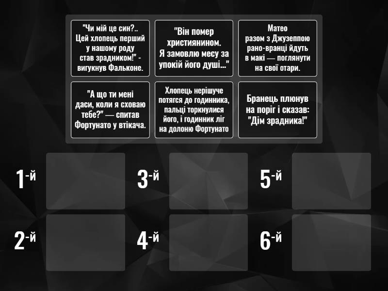 Матео разом з Джузеппою рано-вранці йдуть в макі — поглянути на свої отари., "А що ти мені даси, коли я сховаю тебе?" — спитав Фортунато у втікача., Хлопець нерішуче потягся до годинника, пальці торкнулися його, і годинник ліг на долоню Фортунато, Бранець плюнув на поріг і сказав: "Дім зрадника!", "Чи мій це син?.. Цей хлопець перший у нашому роду став зрадником!" - вигукнув Фальконе., "Він помер християнином. Я замовлю месу за упокій його душі...".
