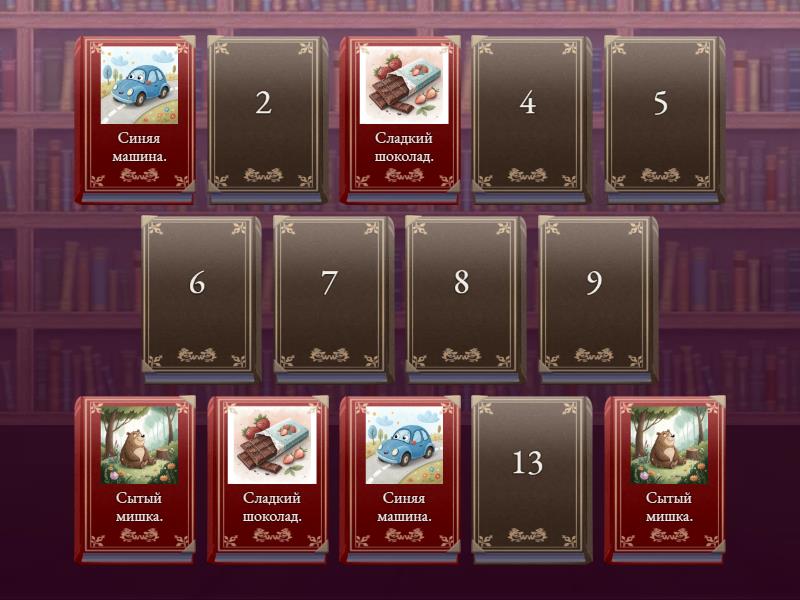 Сладкий шоколад., Синяя машина., Сытый мишка., Спелые вишни., Шахматная доска., Высокая башня., Бабушкин сундук.,