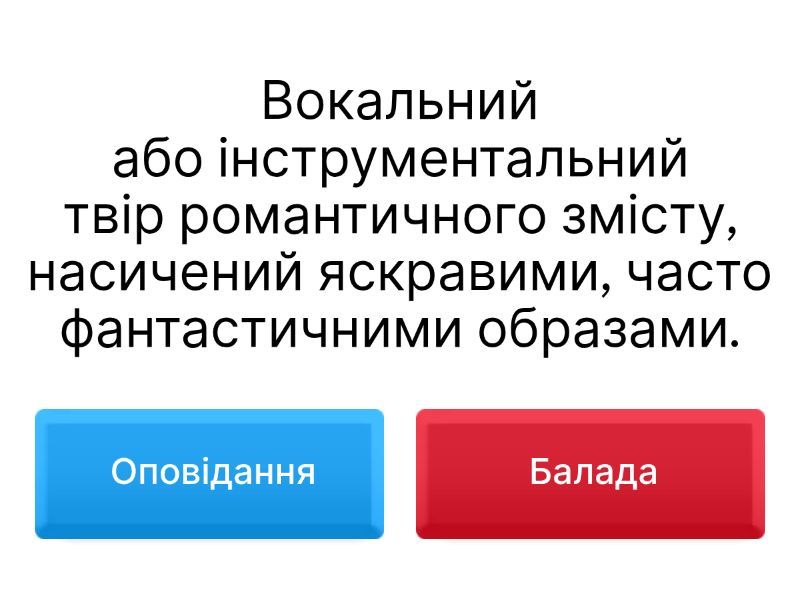 1) Урочиста пісня, прийнята як державний або соціальний символ. a) Гімн b) Солоспів 2) До якого жанру належить пісня? a) Інструментальний b) Вокальний 3) Невеликий за обсягом музичний твір для сольного співу з інструментальним акомпанементом: a) Романс b) Полька 4) Пісня, яку виконують чоловіки для коханої увечері або вночі під її вікнами під супровід гітари, мандоліни, лютні. a) Мандоліна b) Серенада 5) Вокальний або інструментальний твір романтичного змісту, насичений яскравими, часто фантастичними образами. a) Оповідання b) Балада 6) Масштабний за змістом багаточастинний концертний твір для хору, соліста/солістки та симфонічного оркестру: a) Ораторія b) Симфонія 7) Жанр вокально-хорової музики; великий твір для хору, соліста/солістки та симфонічного оркестру. a) Речитатив b) Кантата 8) Жанр камерно-інструментальної музики; п’єса вільного, імпровізаційного характеру. a) Прелюдія b) Танець 9) Жанр камерно-інструментальної музики; невелика п’єса ліричного характеру. a) Пісня b) Ноктюрн 10) Жанр камерно-інструментальної музики; твір вільної форми фантастичного змісту. a) Фантазія b) Балада 11) Жанр камерно-інструментальної музики; твір грайливого, жартівливого характеру, який виконується у швидкому темпі. a) Гумореска b) Скерцо 12) Жанр камерно-інструментальної музики; музичний твір, який складається з контрастних частин і написаний у формі старовинних танців, або твори, об’єднані спільним задумом чи ідеєю. a) Сюїта b) Сарабанда 13) Жанр камерно-інструментальної музики; музичний твір для одного або двох інструментів, що складається із трьох-чотирьох різних за характером і темпом частин. a) Соната b) Реприза