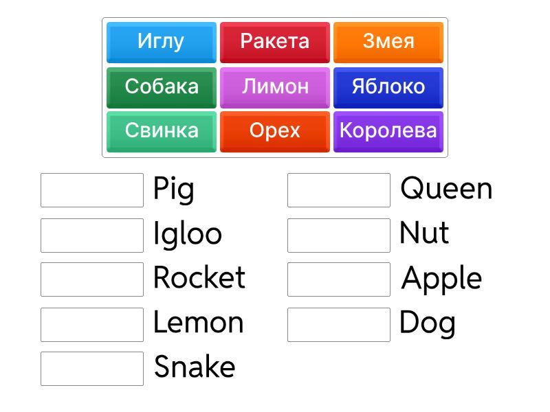 Желудь - Acorn, Яблоко - Apple, Автобус - Bus, Кино - Cinema, Кот - Cat, Собака - Dog, Слон - Elephant, Лягушка - Frog, Девочка - Girl, Жираф - Giraffe, Лошадь - Horse, Мороженое - Icecream, Иглу - Igloo, Варенье - Jam, Кенгуру - Kangaroo, Лимон - Lemon, Мышь - Mouse, Орех - Nut, Овал - Oval, Апельсин - Orange, Свинка - Pig, Королева - Queen, Ракета - Rocket, Змея - Snake, Телефон - Telephone,