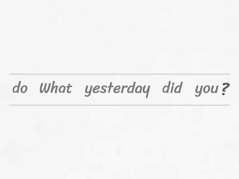 What did you do yesterday?, How long was your journey to school today?, Who did you see last weekend?, Where did you go last night?, How did you feel yesterday?, Where were you at six o’clock yesterday?, What time did you get up this morning?, What was your favourite game when you were a child?, When did you start your English course?, What were your favourite programmes when you were young?,