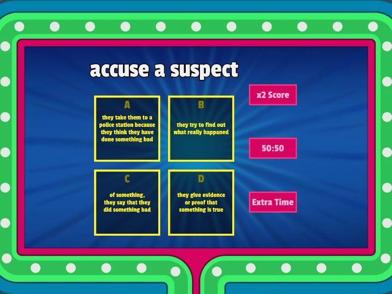 1) accuse a suspect a) they take them to a police station because they think they have done something bad b) they try to find out what really happaned c) of something, they say that they did something bad d) they give evidence or proof that something is true 2) analyse evidence a) of something, they say that they did something bad b) they study it in detail c) they give evidence or proof that something is true d) they ask them things 3) arrest a suspect a) they take them to a police station because they think they have done something bad b) with something, they make an official statement that they think the suspect did something bad c) they get DNA samples or something that can help to show that somebody did something bad d) they study it in detail 4) charge a suspect a) with something, they make an official statement that they think the suspect did something bad b) they ask them things c) of something, they say that they did something bad d) they try to find out what really happaned 5) collect evidence a) they try to find out what really happaned b) they give evidence or proof that something is true c) they ask them things d) they get DNA samples or something that can help to show that somebody did something bad 6) investigate a case a) of something, they say that they did something bad b) they take them to a police station because they think they have done something bad c) they try to find out what really happaned d) they get DNA samples or something that can help to show that somebody did something bad 7) prove something a) they give evidence or proof that something is true b) they ask them things c) they try to find out what really happaned d) with something, they make an official statement that they think the suspect did something bad 8) question a suspect a) with something, they make an official statement that they think the suspect did something bad b) of something, they say that they did something bad c) they ask them things d) they take them to a police station because they think they have done something bad