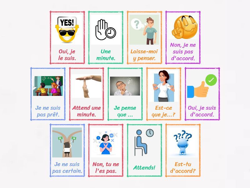 Une minute. - Just a minute., Je ne suis pas prêt. - I'm not ready., Attend une minute. - Wait a minute., Attends! - Hold on!, Je ne suis pas certain. - I'm not sure, Laisse-moi y penser. - Let me think, Est-ce que je...? - Do I ...?, Oui, je le suis. - Yes, you are., Non, tu ne l'es pas. - No, you are not., Est-tu d'accord? - Do you agree?, Oui, je suis d'accord. - Yes, I agree., Non, je ne suis pas d'accord. - No, I disagree., Je pense que ... - I think that...,