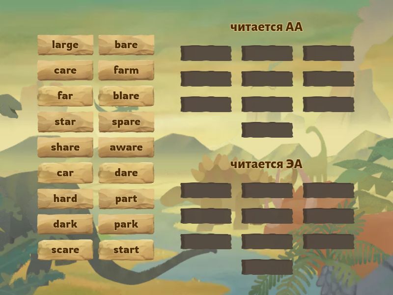 читается АА: car, far, hard, park, farm, dark, star, start, part, large, читается ЭА: share, dare, care, blare, spare, aware, bare, scare,