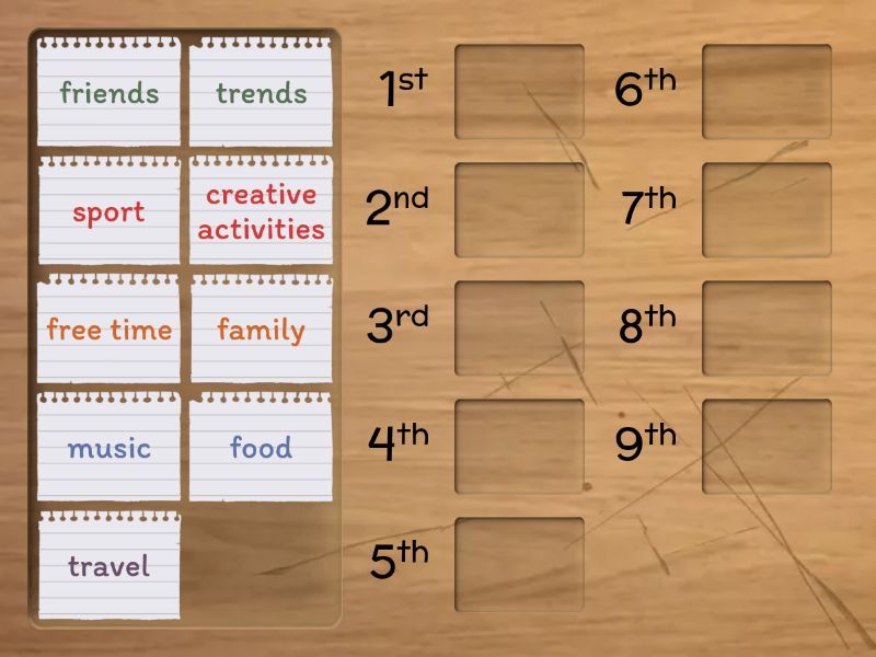 creative activities, family, food, free time, friends, music, sport, travel, trends.