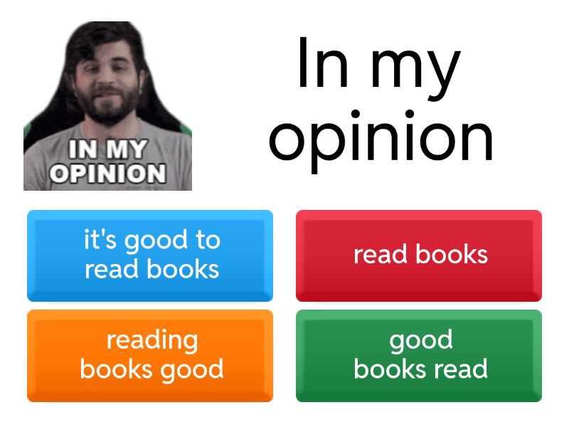 1) In my opinion a) it's good to read books b) read books c) reading books good d) good books read 2) Personally, I prefer a) playing computer games b) to play computer games c) play computer games 3) I find a) most books interesting b) interesting books c) books most interesting 4) I really think that a) English interesting b) English is interesting c) interesting English d) is English interesting 5) I really like a) to cook b) cook c) cooking d) is cook 6) I prefer a) reading b) read c) to read d) am read 7) I don't mind a) watch TV b) to watch TV c) TV watch d) watching TV 8) I prefer a) BMW to Mercedes b) Mercedes BMW c) BMW than Mercedes
