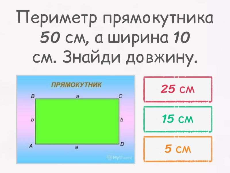 1) Периметр прямокутника 50 см, а ширина 10 см. Знайди довжину. a) 25 см b) 15 см c) 5 см 2) Периметр прямокутника 70 м, довжина- 20 м. Знайди ширину прямокутника. a) 15 м² b) 25 м c) 15 м 3) Довжина прямокутника 9 м, площа 63м². Знайди ширину. a) 6 м² b) 7 м c) 7 м² 4) Площа квадрата- 36 см². Знайди сторону квадрата a) 18 см² b) 9 см c) 6 см 5) Периметр прямокутника- 24 см. Довжина -10 см. Знайти ширину. a) 2см b) 14см c) 4 см